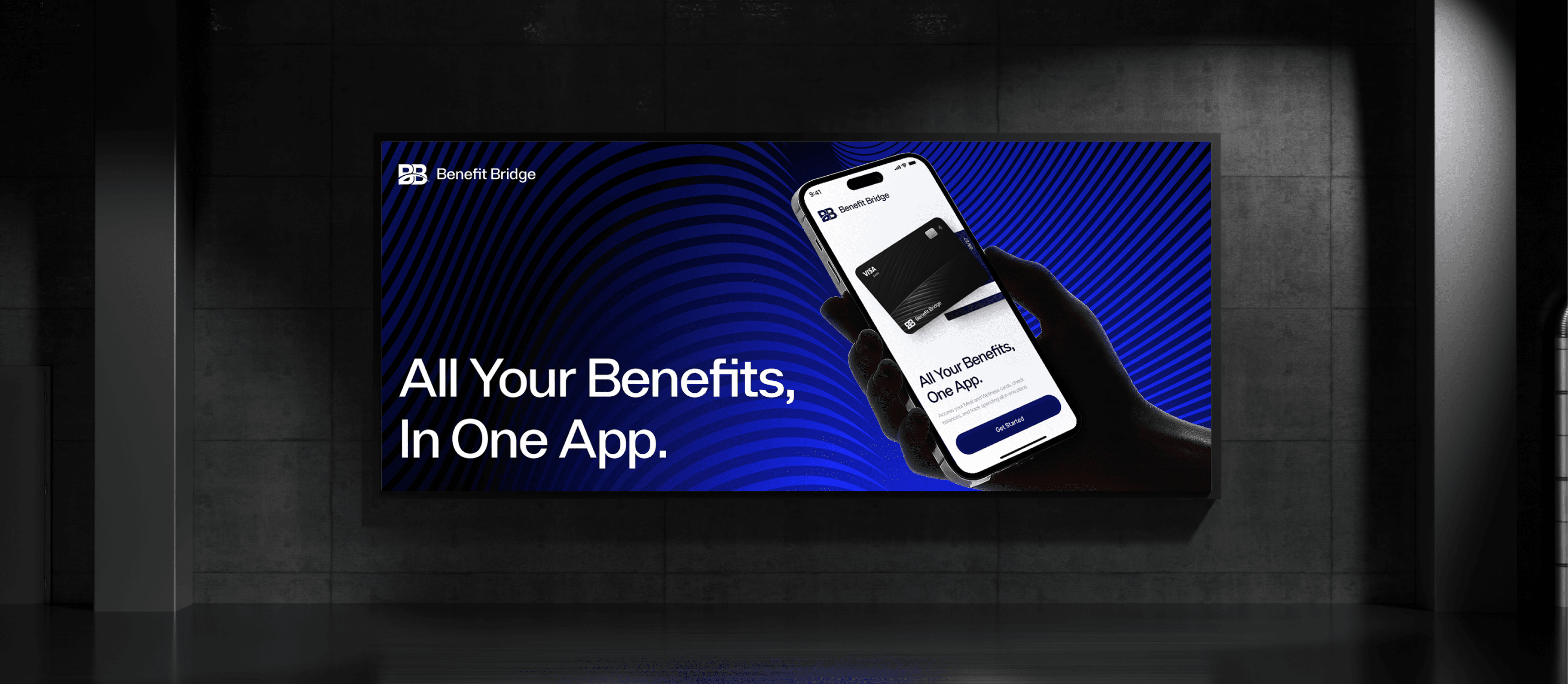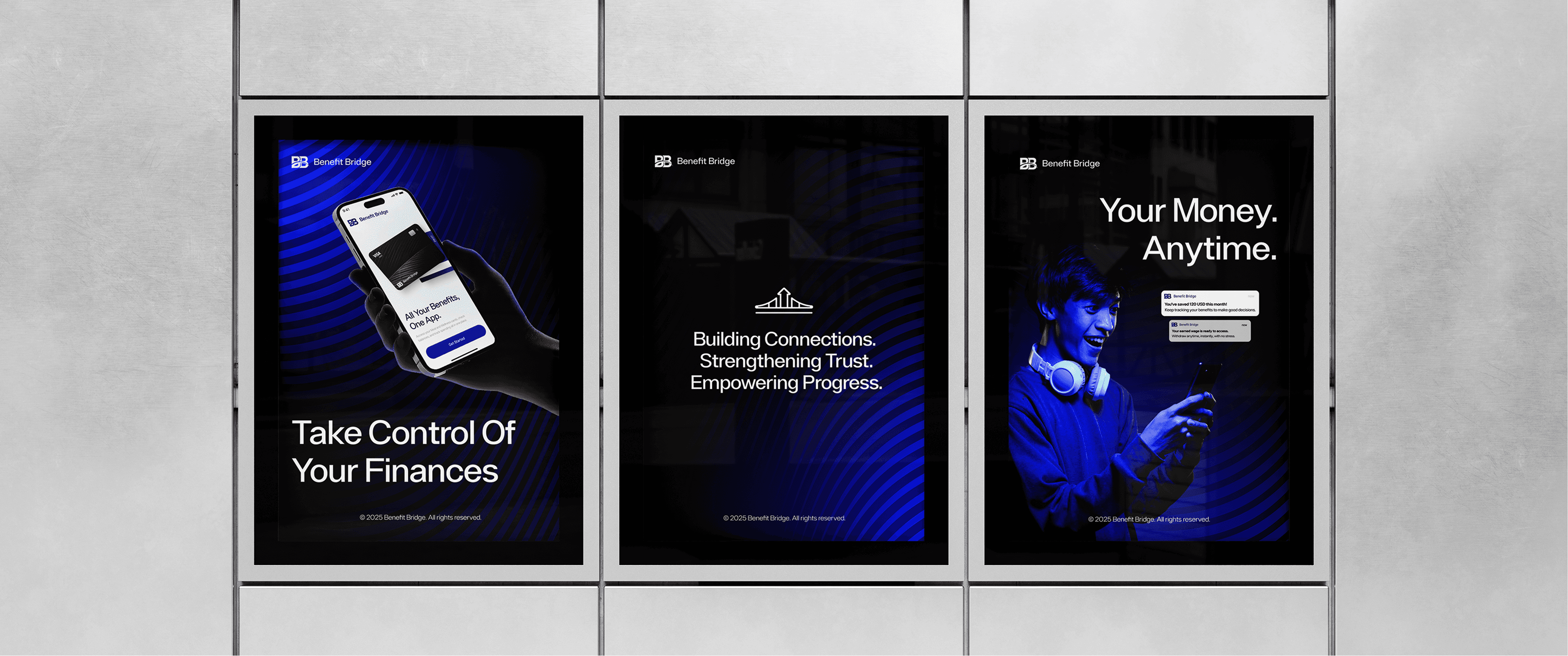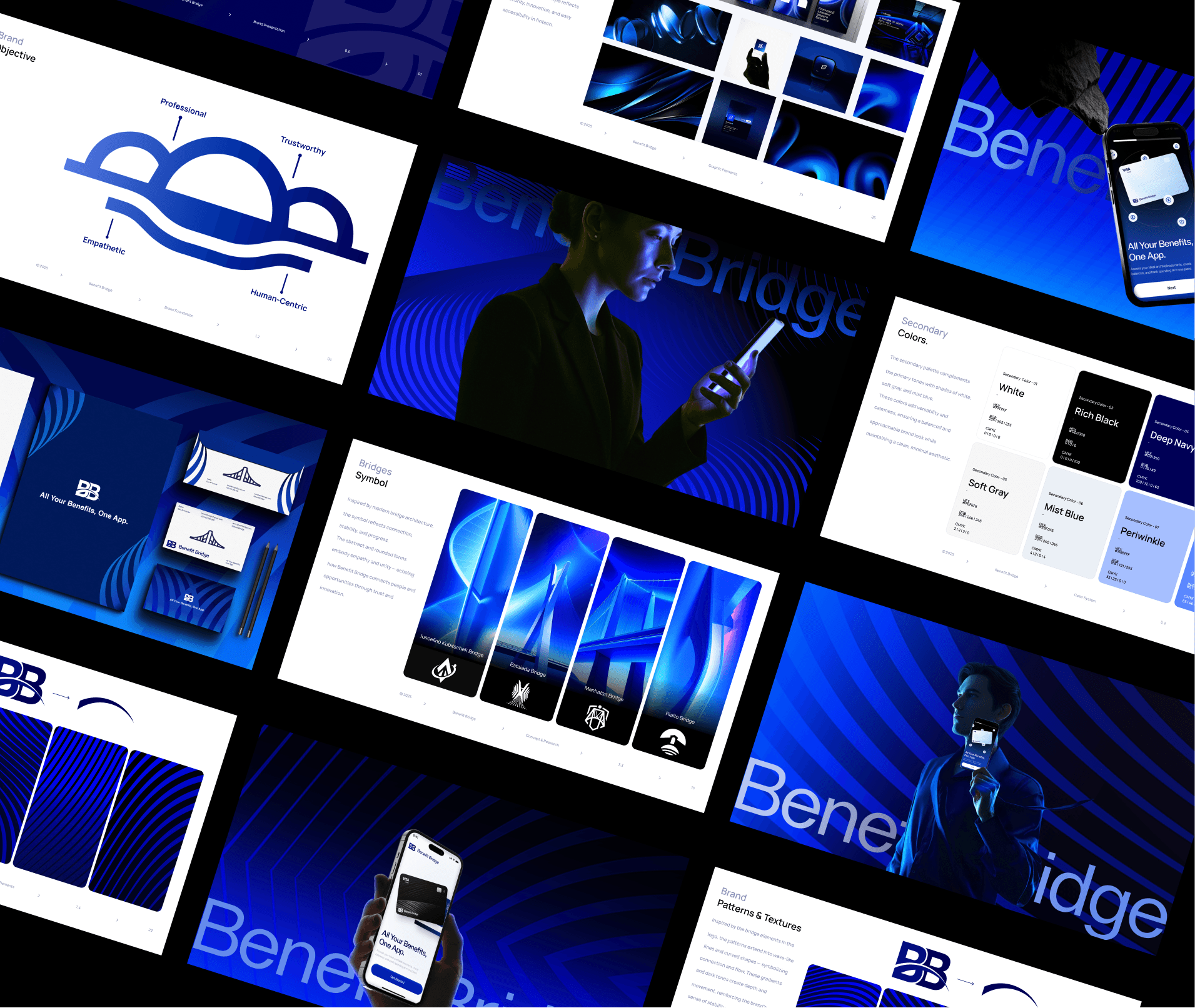 The updated identity system features a more defined logo structure, a balanced visual language, and a unified tone that positions Benefit Bridge as a supportive, modern, and forward-thinking fintech solution.