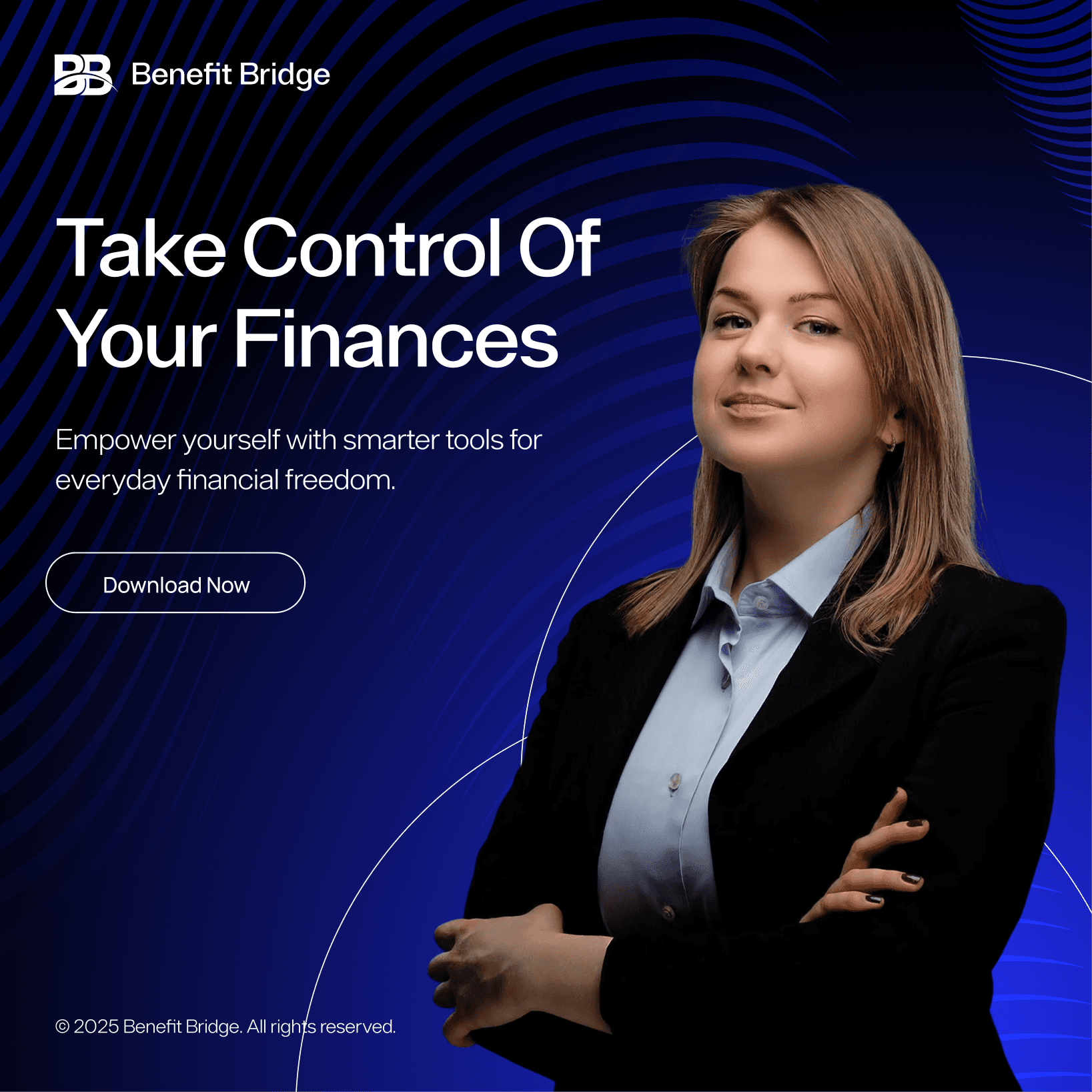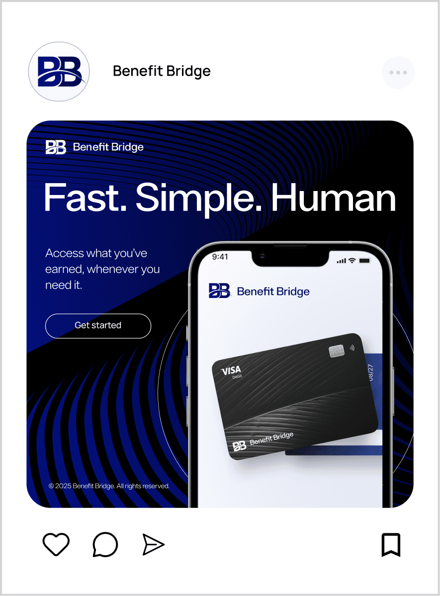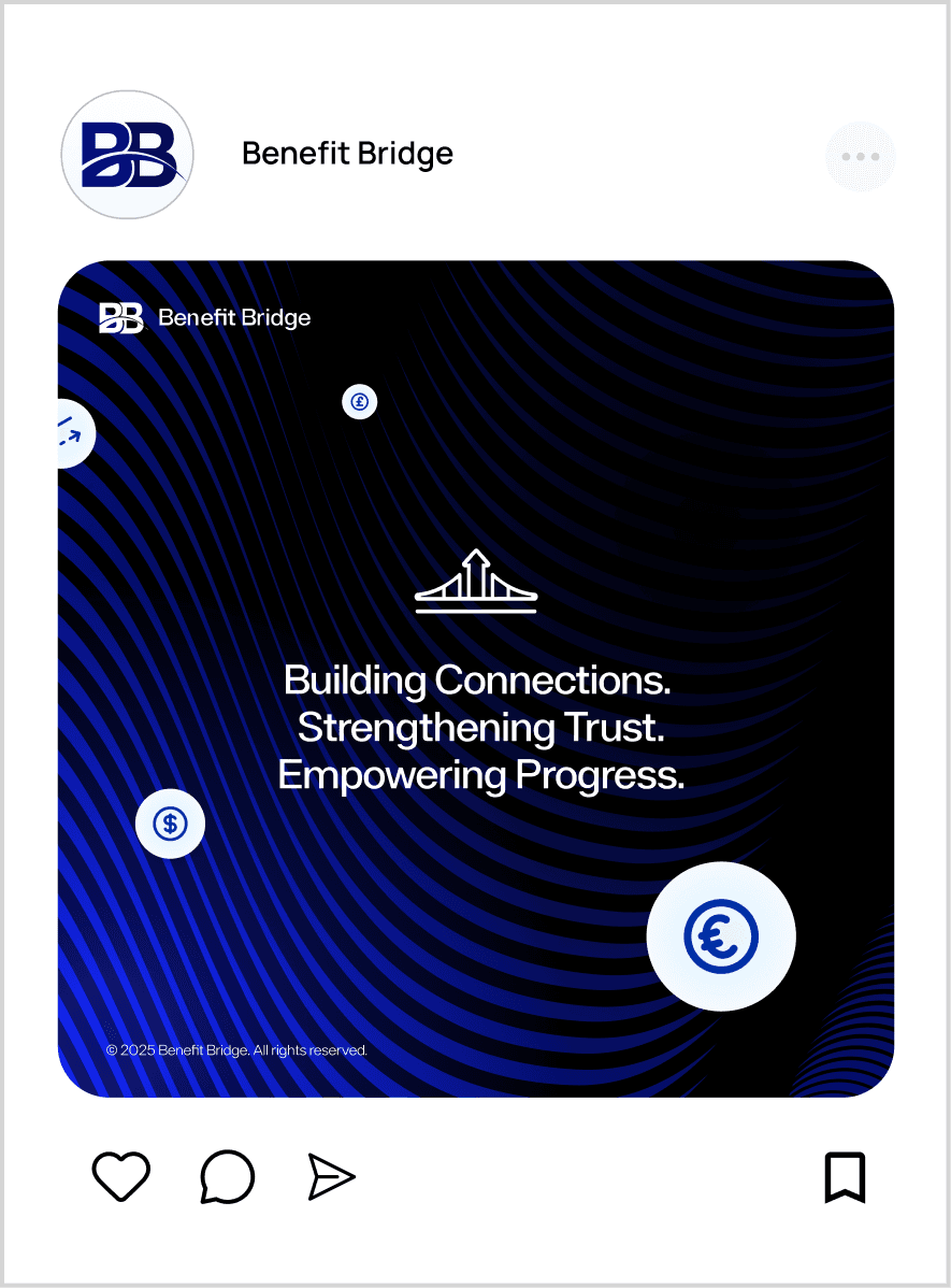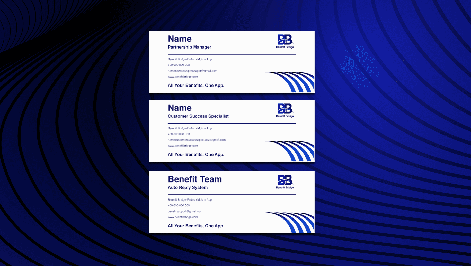 The updated identity system features a more defined logo structure, a balanced visual language, and a unified tone that positions Benefit Bridge as a supportive, modern, and forward-thinking fintech solution.
