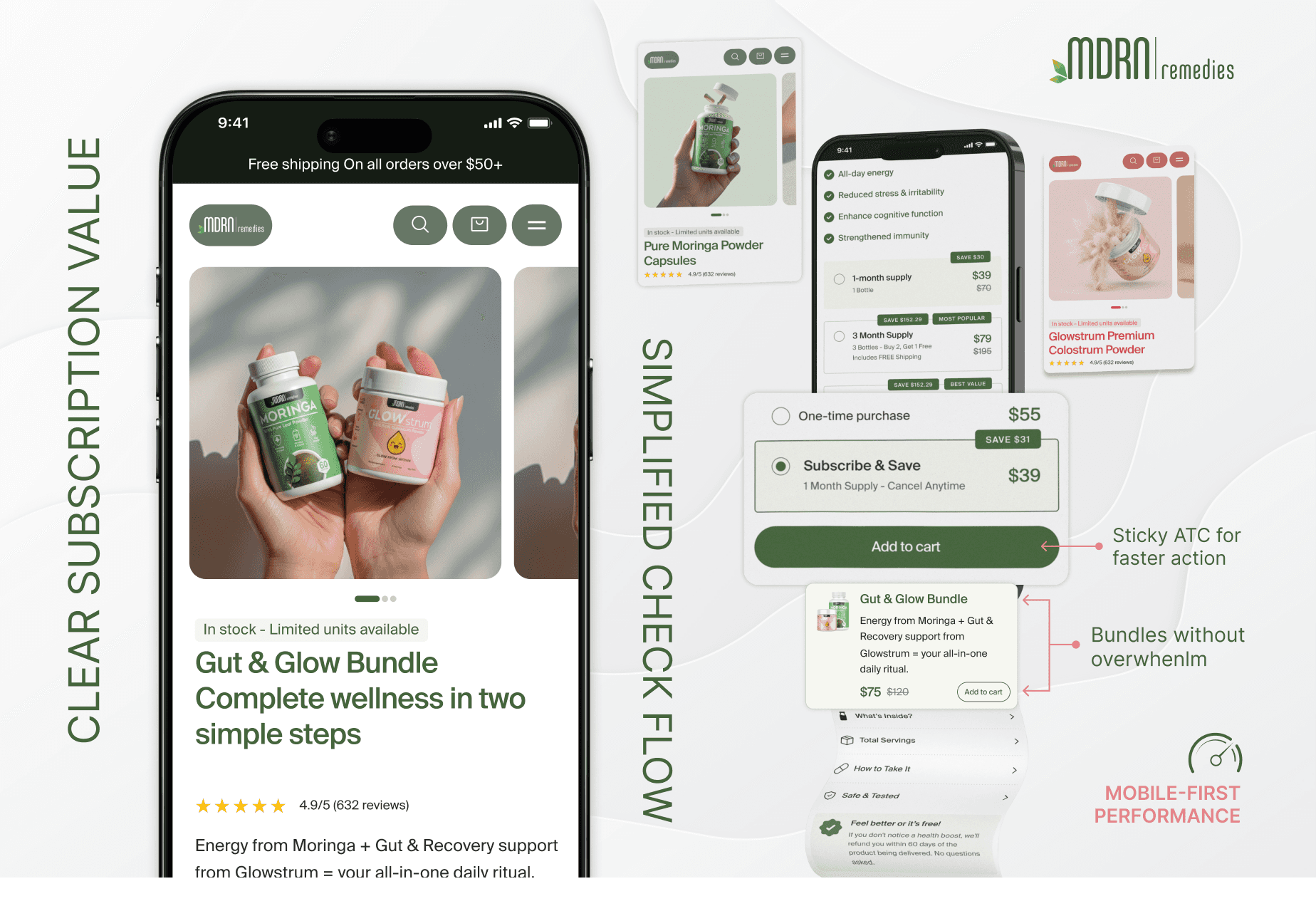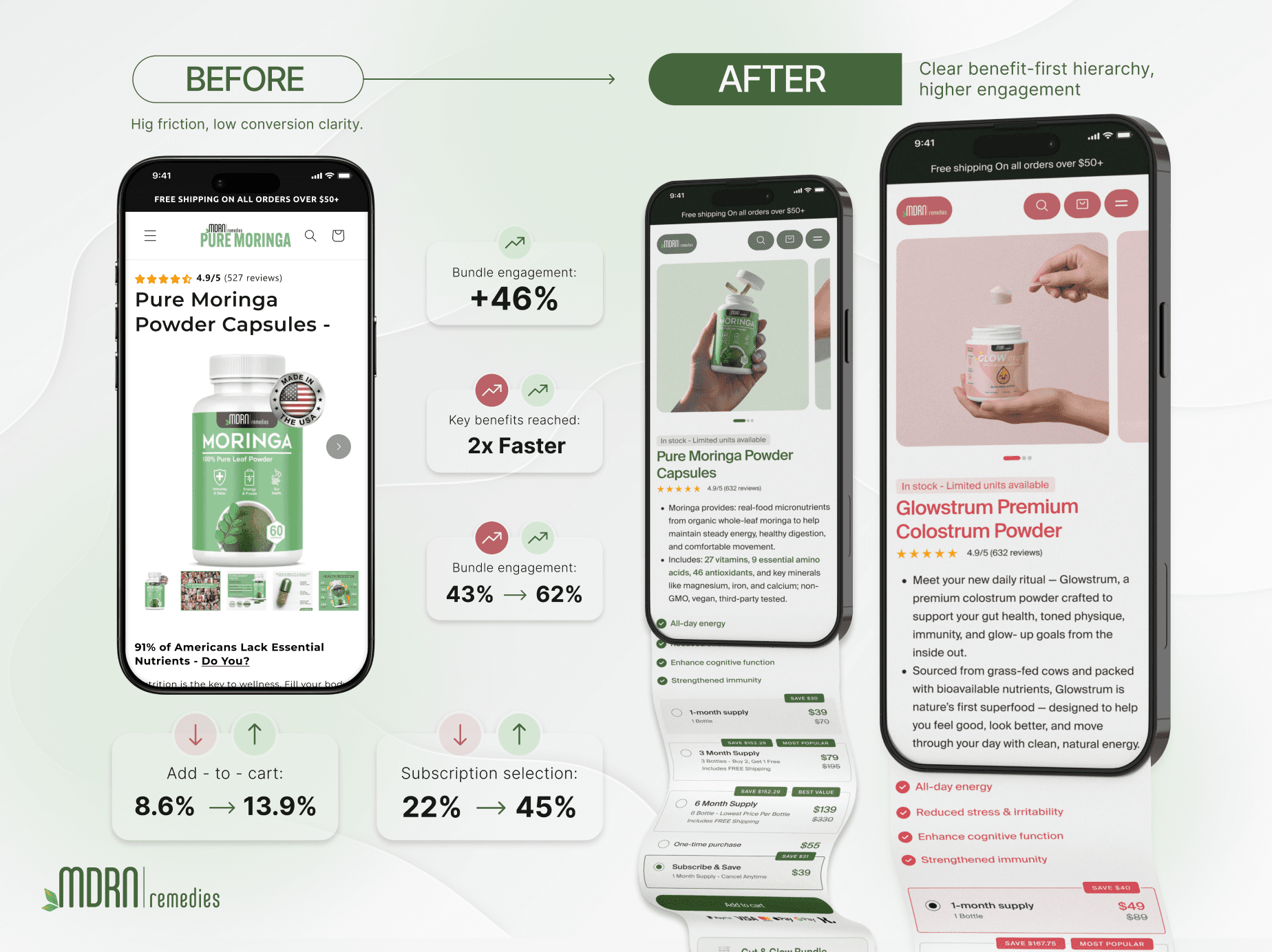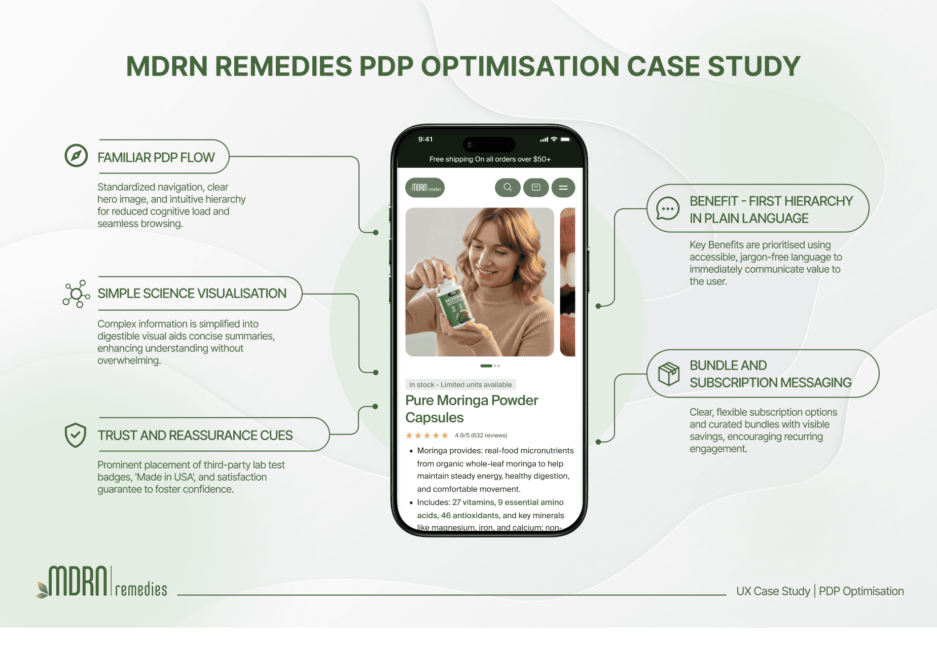 This phase turned MDRN’s PDPs into structured funnels designed to guide users from curiosity → understanding → confidence → purchase, with a special focus on improving mobile clarity, supporting both mobile UX improvements and higher mobile conversion rates.