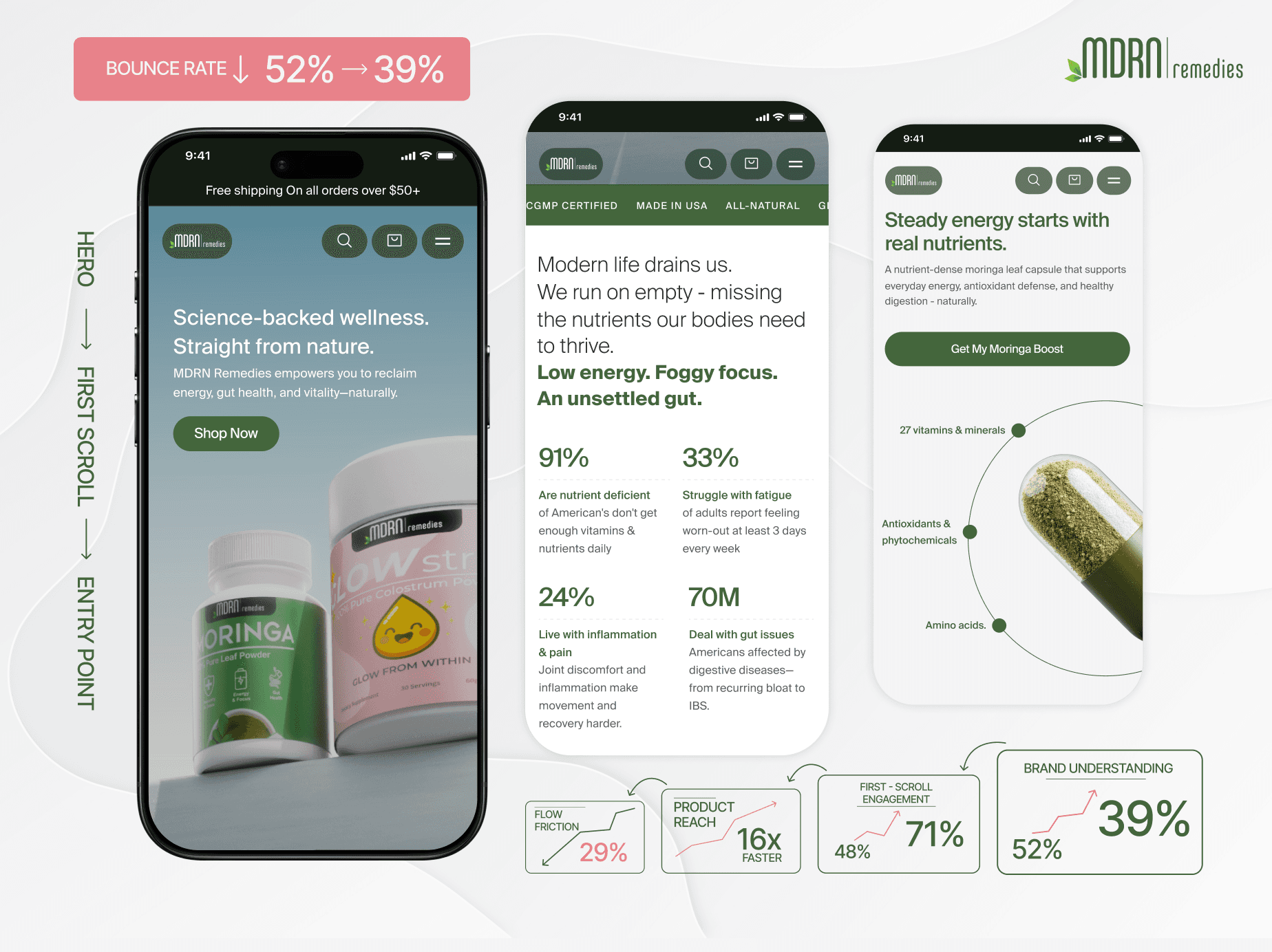 MDRN Remedies is a fast-growing wellness brand offering natural supplements designed to help individuals feel energised, balanced, and healthier in their daily lives. Their two hero products — Pure Moringa and Glowstrum (colostrum) — serve active individuals, gut-health seekers, and people wanting to age with more vitality.